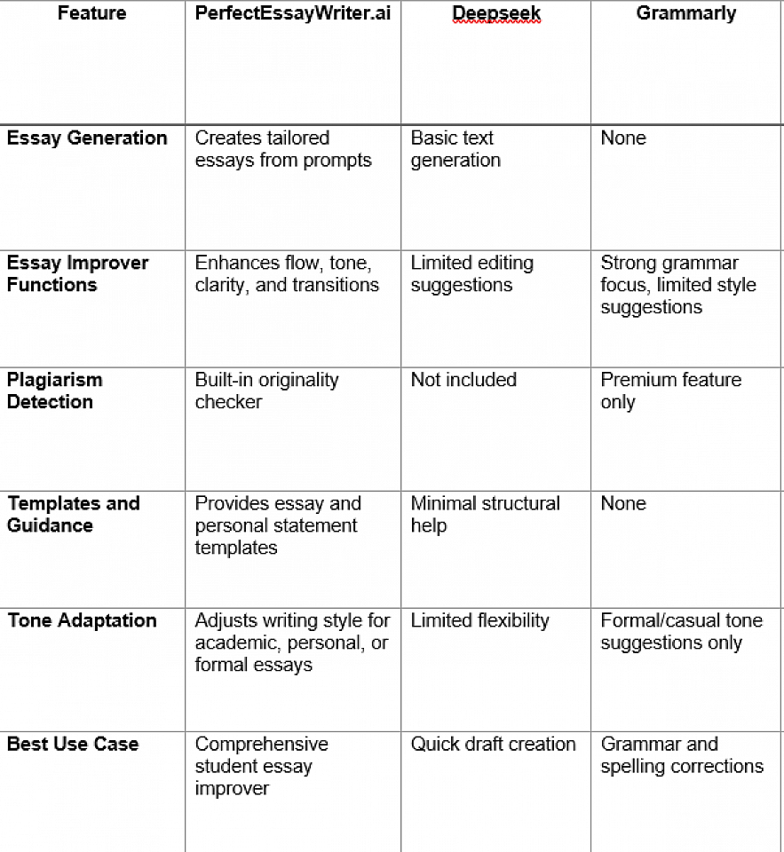 There are several tools available that promise to help students with writing. Here’s how PerfectEssayWriter.ai compares to other well-known options like Deepseek and Grammarly.